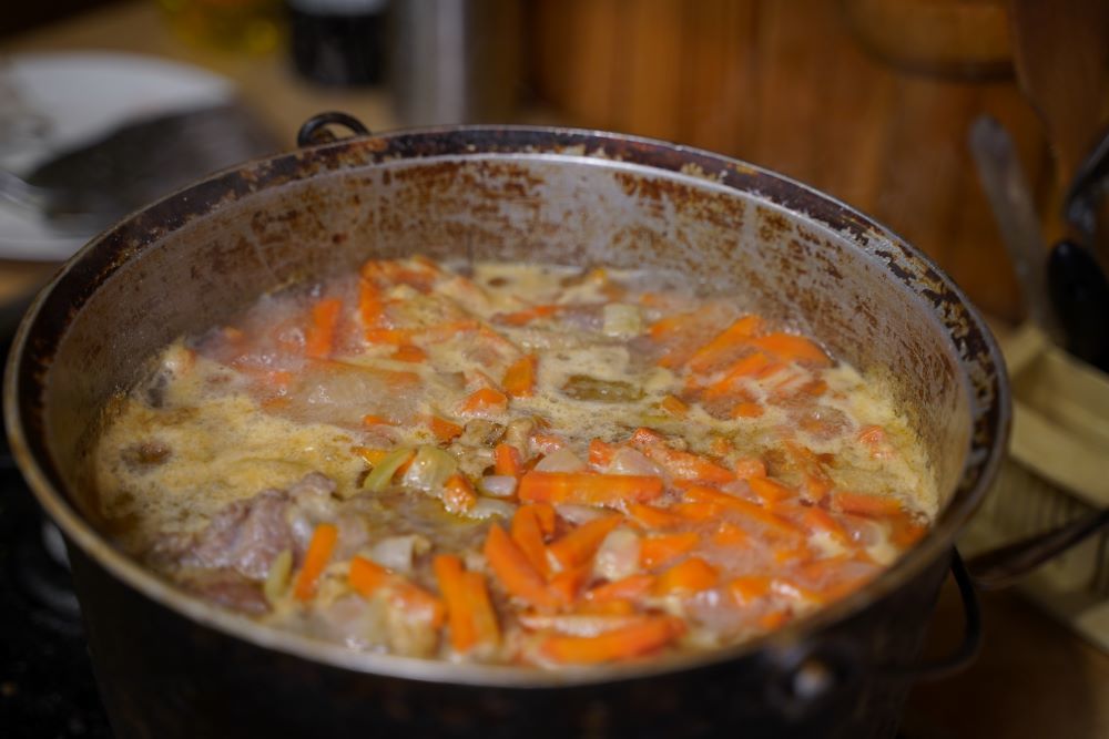 Gerai įkaitiname specialų virš ugnies pakabinamą metalinį puodą. Mėsą gerai apskrudiname, toliau į puodą dedame apkeptus svogūnus, o po 10 minučių dedame morkas. Viską patroškiname, užpylus vandens.