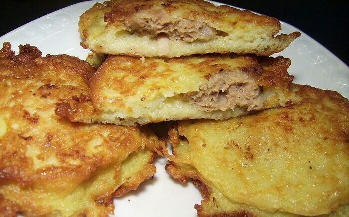 Bulviniai blynai su mėsa – labai skanus ir sotus patiekalas, kuris gali suteikti mums energijos ilgam, ypač jei patiekiame su grietine. Kokie skanūs šie bulviniai blynai įdaryti mėsa! Pavalgius tokių sočių blynų, alkio jausmas išnyksta ilgam.