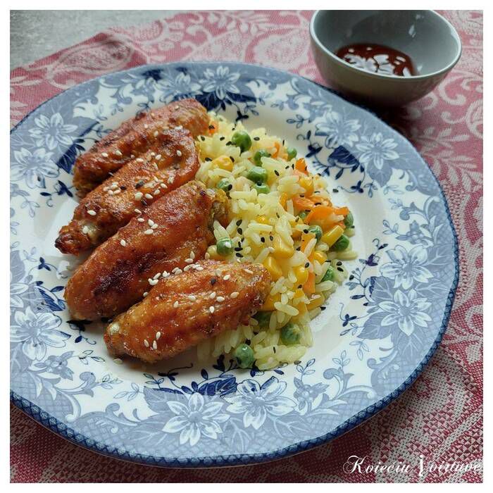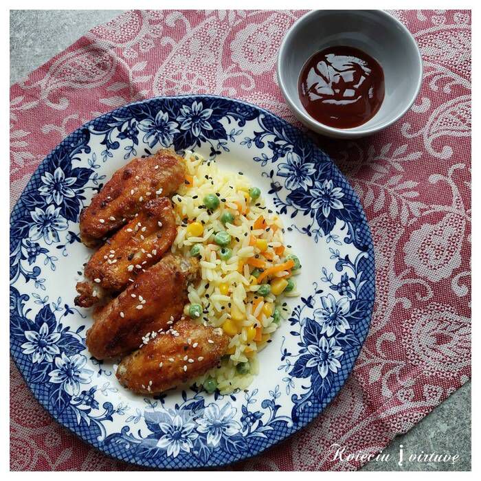 Jau kelias dienas iš eilės grilinome lauke. Daugiau nebesinori kepsnių, į kotletus vaikai žiūrėti sakė nebegali. Tad glazūruoti vištienos sparneliai su ryžiais, bei daržovėmis nugulė ant mūsų stalo. Visi nutarė, kad buvo skanu. O kai sotūs ir laimingi namiškiai – aš tampu dar laimingesnė.