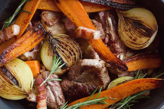 4 asmenimsPagaminsite per 2 val. 30 min.Įvertinkite:4.2 / 9ReceptasIngredientaiAliejus : 4.00 valg. š. (kepimui)Jautienos šonkauliai : 1.00 gŠoninė : 150.00 g (supjaustytos kubeliais)Svogūnai : 2.00 vnt. (vidutiniai, perpjauti per pusę)Morkos : 4.00 vnt. (perpjautos išilgai)Rozmarinai : 1.00 valg. š. (šviežio)Čiobreliai : 1.00 valg. š. (šviežių)Vištienos sultinys : 500.00 mlDruska : 1.00 arbat. š.Kaip gaminti1. Aliejuje gerai apkepiname jautienos šonkaulius. Sudedame juos į troškinimo indą. Apkepame šoninę, kuri irgi keliauja ant šonkaulių.