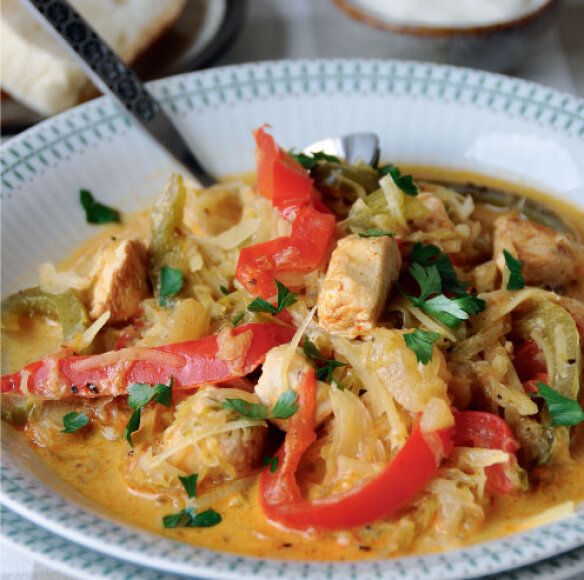 - Aš esu krūtinėlės mėsos šalininkė, todėl troškinuką dažniausiai gaminu su kalakutienos ar vištienos file. Bet kam patinka kitokia mėsos tekstūra, šis patiekalas puikiai tinka ir su šlaunelių mėsa, tiek kalakutienos, tiek vištienos. Vištienos šlaunelių gabalėlius galima net ir trumpiau troškinti.