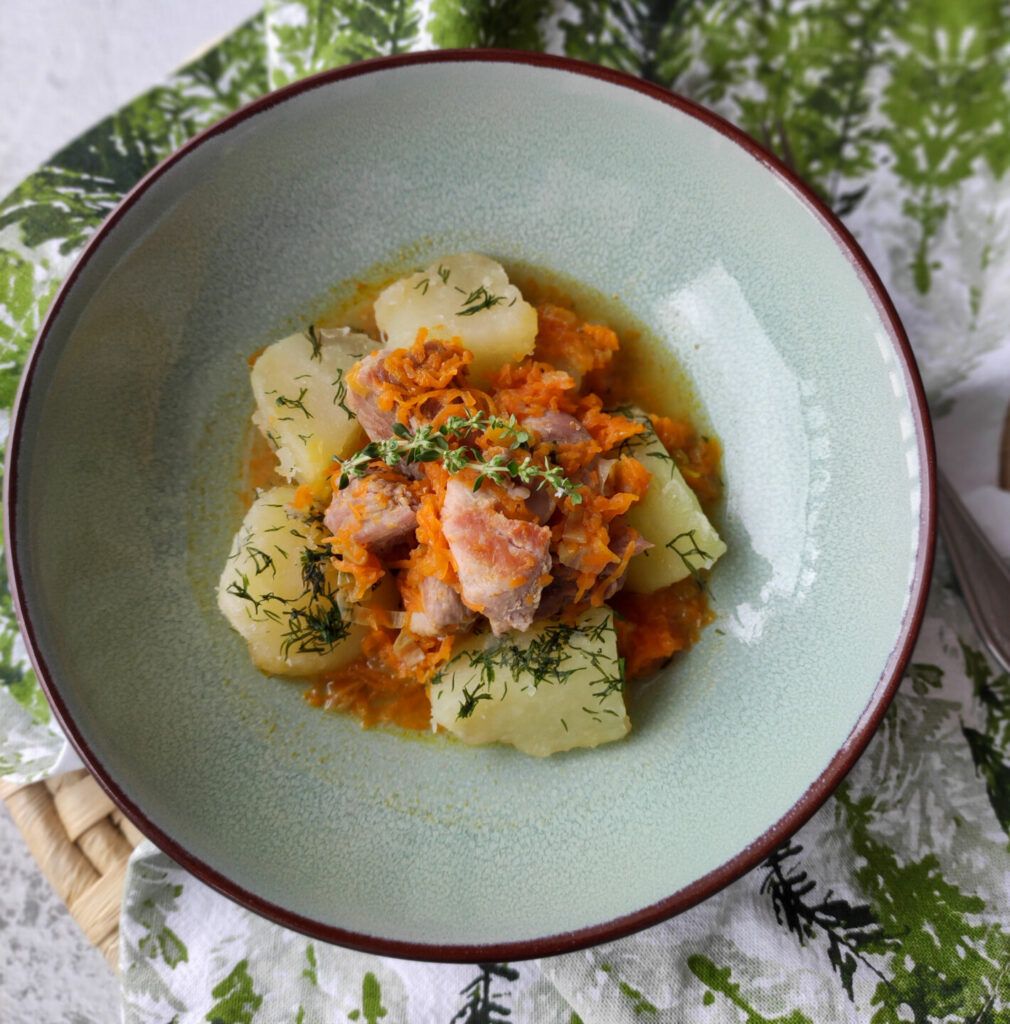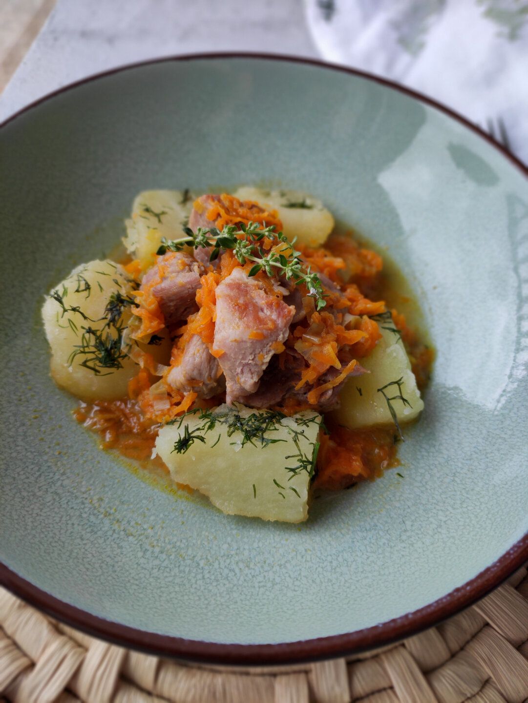 Bulves supjaustyti vieno kąsnio gabalėliais, morką susmulkinti smulkiais gabaliukais.Į puodą dėti apkeptą mėsytę, daržoves, užpilti sultiniu, kad jis viską apsemtų ir troškinti tol, kol viskas suminkštės.