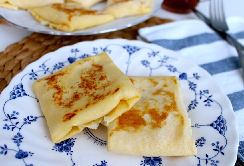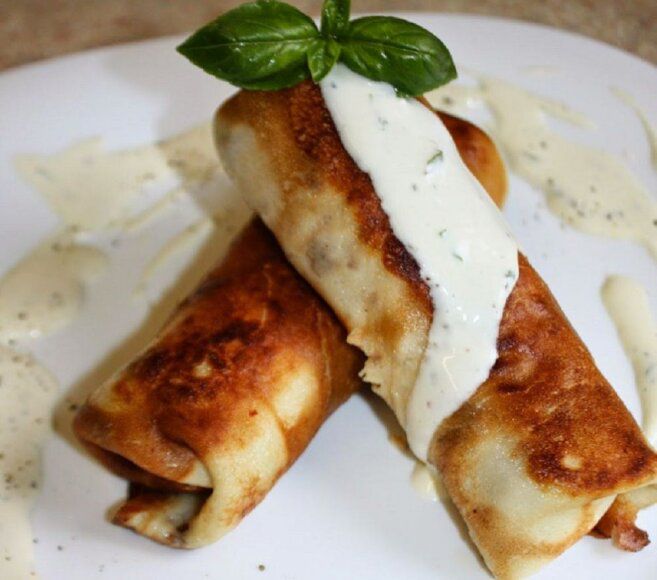 7. Keptuvėje virš vidutinio dydžio kaitros įkaitinkite šlakelį aliejaus. Dėkite sulankstytus blynelius ir kepkite porą minučių, tuomet apverskite ir kepkite dar porą minučių, kol viduje įdaras iškeps, o išorėje lietiniai blyneliai gražiai apskrus.