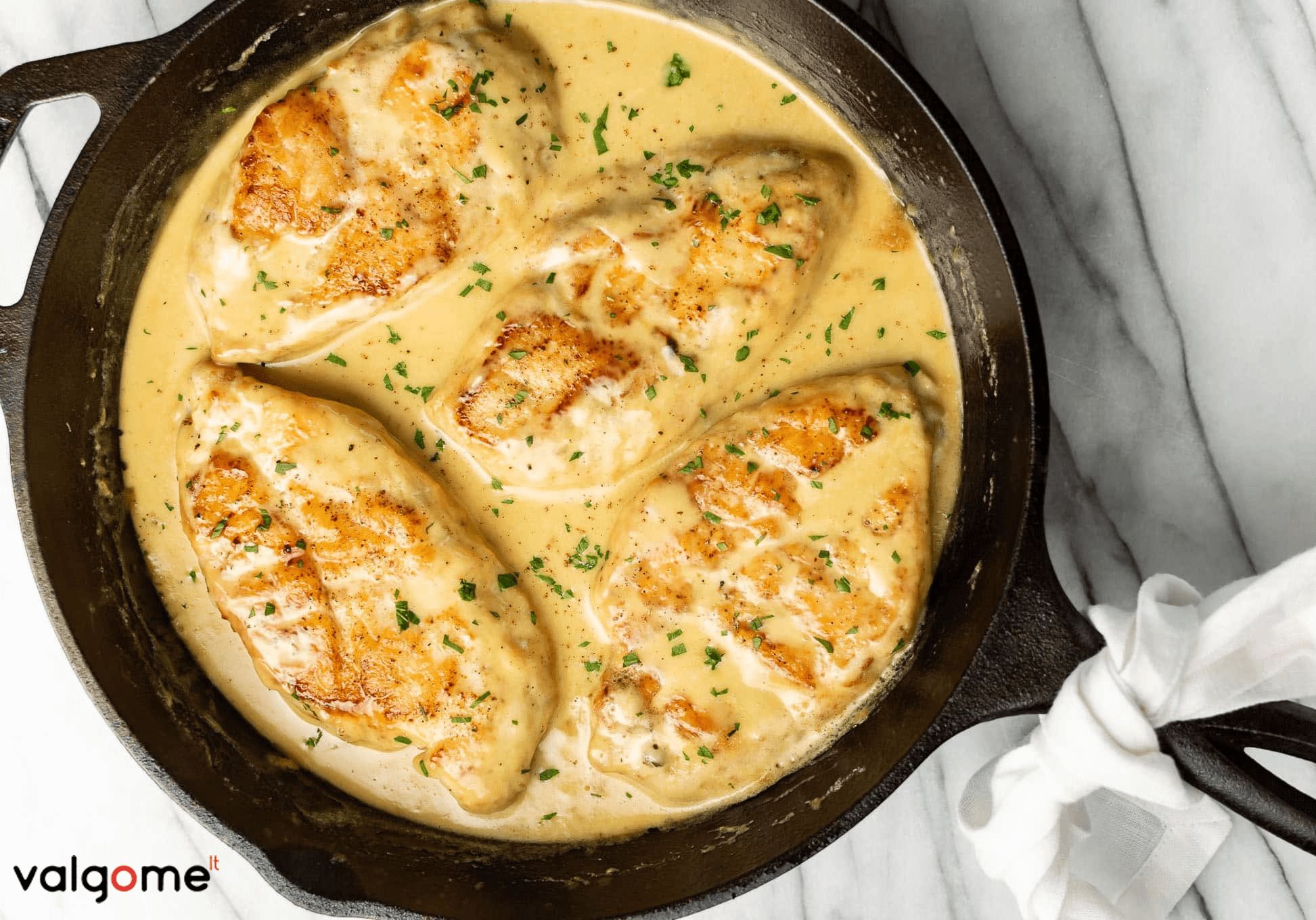 4. Keptuvėje virš vidutinės ugnies įkaitinkite alyvuogių aliejų. Dėkite miltuose apvoliotus kepsnius ir kepkite apie 4-5 minutes iš vienos pusės. Tuomet apverskite ir kepkite 3-4 minutes iš kitos pusės. Vištiena turi būti iškepusi viduje ir gardžiai apskrudusi išorėje. Tikslus kepimo laikas priklausys nuo kepsnių storumo. Jei turite galimybę, naudokite maistinį termometrą ir kepkite vištieną iki 72 °C vidinės temperatūros. Iškeptus kepsnius išimkite į lėkštę ir atidėkite į šalį. Uždenkite kita lėkšte ar dangčiu, kad kuo ilgiau išlaikytumėte šiltus.