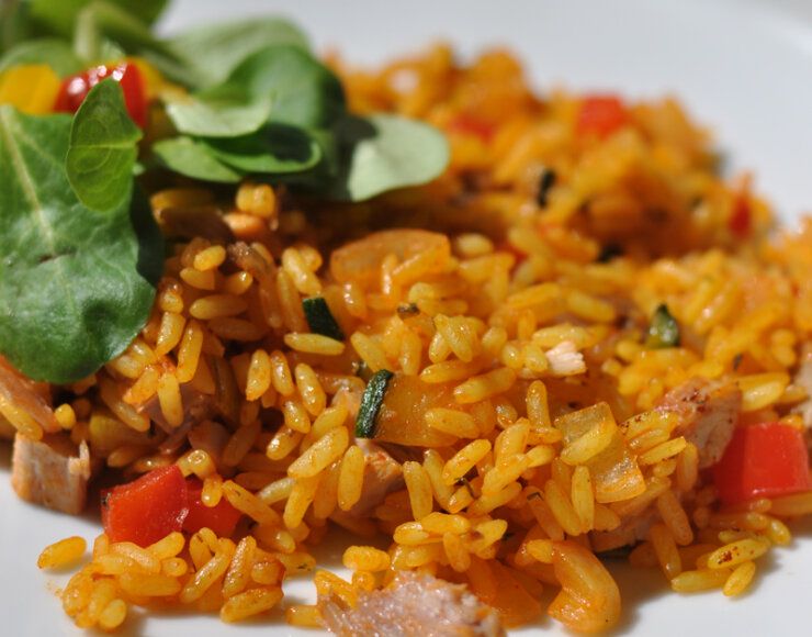 Šis patiekalas labai sotus ir skanus. Jis gali būti saugiai paruoštas ant šventinio stalo. Vištiena su ryžiais geriausia patiekti karštus. Prie jų drąsiai galite paruošti daržovių salotas. Šiam patiekalui galite naudoti bet kurią vištienos dalį. Ryžiai gali būti apvalūs arba ilgagrūdžiai. Grietinėlę geriau naudoti riebesnę.