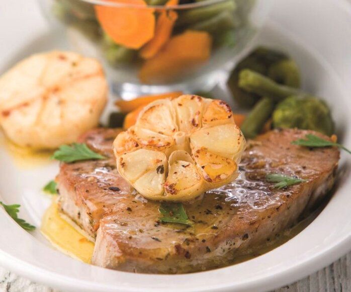 1. Visą tuno gabalą įtrinkite druska, pipirais, susmulkintais česnakais, užpilkite vynu ir 24 val. laikyti šaldytuve. Išimkite iš marinato, supjaustykite porcijomis ir iškepkite aliejuje (kepti po 5 min. kiekvieną pusę).